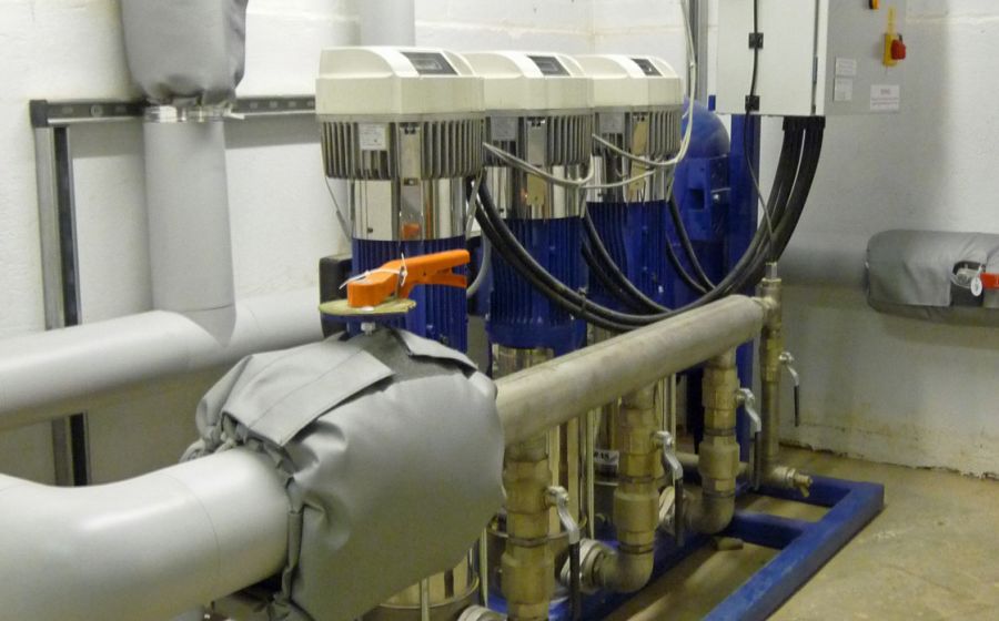 - The domestic cold-water services (and HWS cold feed) are fed from a pre-insulated GRP break tank, with a nominal storage capacity of 12,000ltrs. A cold-water pressure booster set complete with 3 No. variable speed pumps capable of providing a maximum simultaneous water flow rate of 6.5ltr/sec @ 3.0 bar gauge.